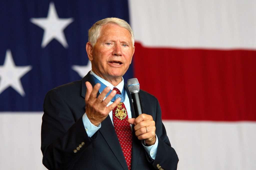 Retired Lt. Col. Leo Thorsness speaks at the U.S. Air Forces in Europe’s Air Force 60th Anniversary celebration Aug. 11 Ramstein Air Base, Germany. Colonel Thorsness is a Medal of Honor recipient. (U.S. Air Force photo/Airman 1st Class Kenny Holston)